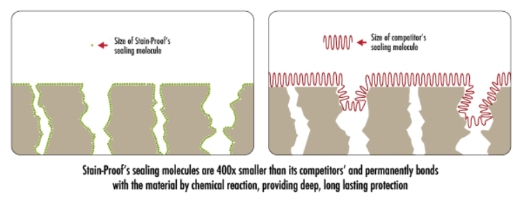 The special penetrating sealer molecules are hundreds of times smaller than competitor stone sealers and penetrate much deeper into the pore structure, even dense natural stones like granite. Inside the pores our special sealing molecules bond permanently by chemical reactions, creating a substantial, deep oil and water-repellent barrier.